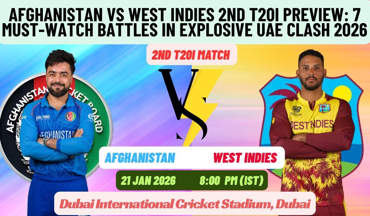 1. When and where is the Afghanistan vs West Indies 2nd T20I 2026 being played? The AFG vs WI 2nd T20I 2026 is scheduled for January 21, 2026, at 6:30 PM local time (8:00 PM IST) at Dubai International Cricket Stadium. Afghanistan lead the three-match UAE T20I series 1-0 after their 38-run win in the opener.