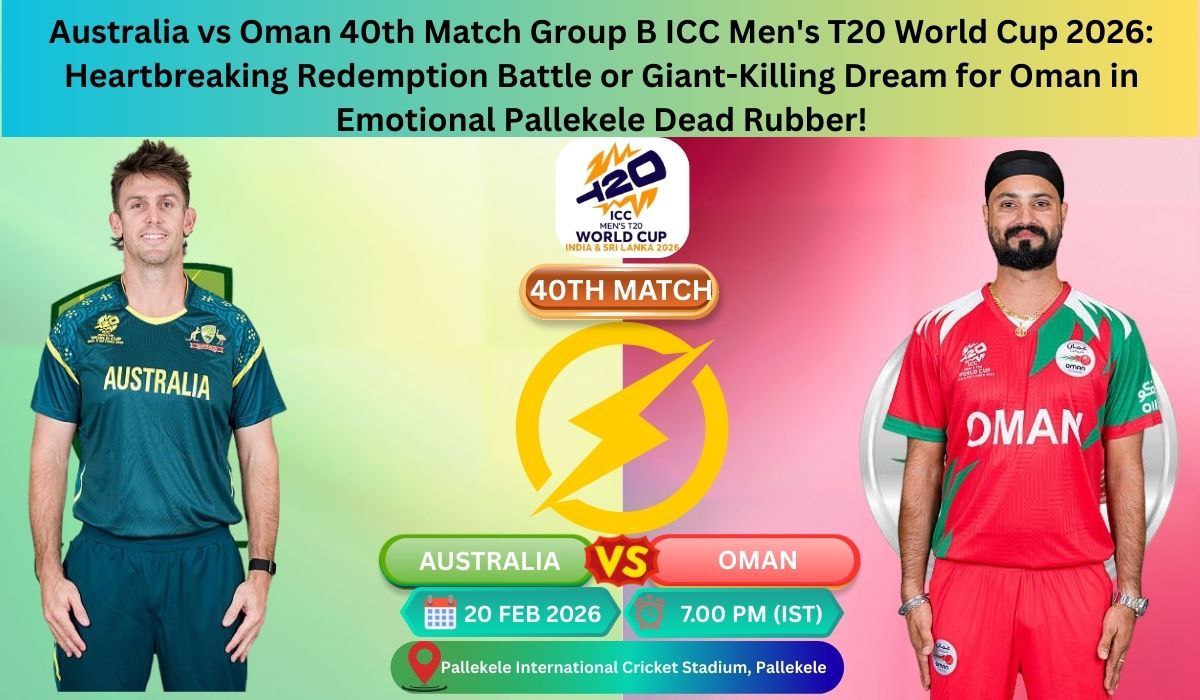 1. When is the Australia vs Oman 40th Match Group B ICC Men’s T20 World Cup 2026 and at what time? The Australia vs Oman 40th Match Group B ICC Men’s T20 World Cup 2026 is set for February 20, 2026, at 7:00 PM SLT/IST (1:30 PM GMT) at Pallekele International Cricket Stadium. Toss is at 6:30 PM. This dead rubber carries huge emotional weight for Australian fans seeking redemption and Omani fans dreaming of a giant-killing.