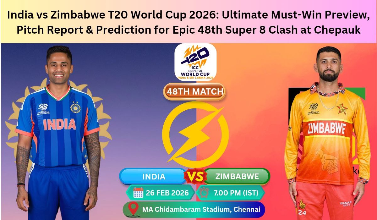 Indian cricket fans, after that heartbreaking 76-run thrashing by South Africa, your hearts are still racing. The defending champions face Zimbabwe in the 48th Match of the ICC Men’s T20 World Cup 2026 Super 8 Group 1 at MA Chidambaram Stadium, Chennai on Thursday, 26 February 2026. This India vs Zimbabwe T20 World Cup 2026 encounter is not just another game — it is the ultimate redemption battle that could decide whether Suryakumar Yadav’s men march into the semi-finals or face an early exit.