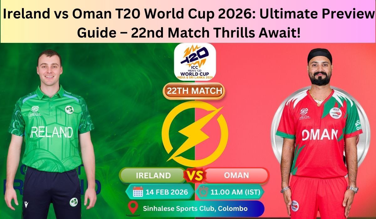 1. When and where is the Ireland vs Oman T20 World Cup 2026 match scheduled? The Ireland vs Oman T20 World Cup 2026 Group B clash (22nd Match) is set for February 14, 2026, at 11:00 AM local time (5:30 AM GMT) at the Sinhalese Sports Club (SSC), Colombo, Sri Lanka.