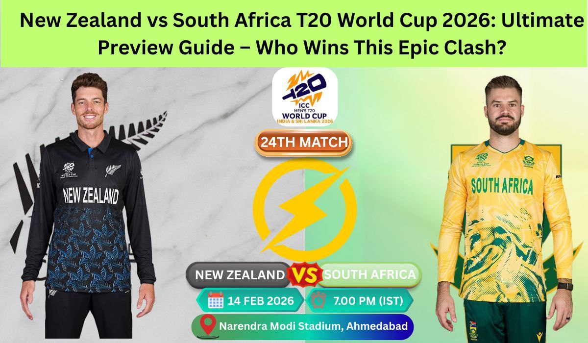 1. What is the date and time for New Zealand vs South Africa T20 World Cup 2026? The New Zealand vs South Africa T20 World Cup 2026 24th match is on February 14, 2026 (Valentine’s Day) at 7:00 PM IST (1:30 PM GMT) at Narendra Modi Stadium, Ahmedabad. Perfect evening timing for fans worldwide!