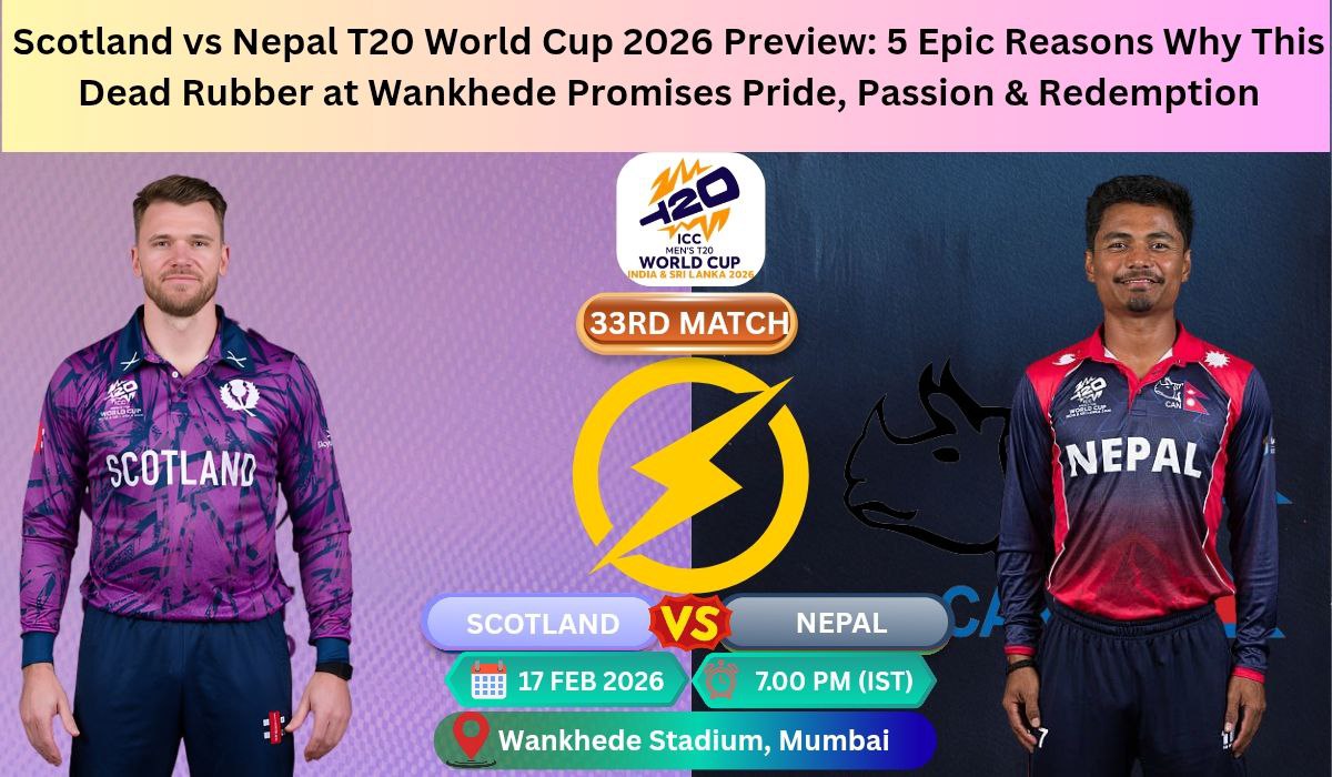 Scotland vs Nepal T20 World Cup 2026 preview – this clash might be a dead rubber on paper, but for fans of associate nations cricket, it’s loaded with emotion. On February 17, 2026, at Mumbai’s iconic Wankhede Stadium, two determined sides – Scotland and Nepal – meet in the 33rd Match of Group C in the ICC Men’s T20 World Cup 2026. Both teams are already eliminated from Super Eights contention, yet the battle for pride, a maiden WC win for Nepal, and a positive send-off makes this one unmissable.