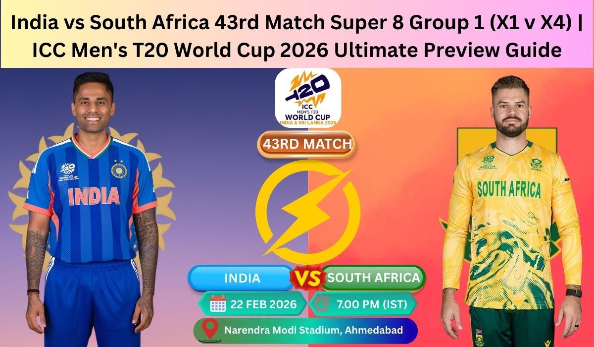 India vs South Africa 43rd Match Super 8 Group 1 (X1 v X4) | ICC Men’s T20 World Cup 2026 Ultimate Preview Guide 21 February 2026 by iplstar.in Two unbeaten giants collide in the “final before the final” – India (12-0 in T20 World Cups) vs South Africa (unbeaten in league stage) at Narendra Modi Stadium on 22 Feb 2026. Full preview, black-soil pitch report, probable XIs, prediction & more.